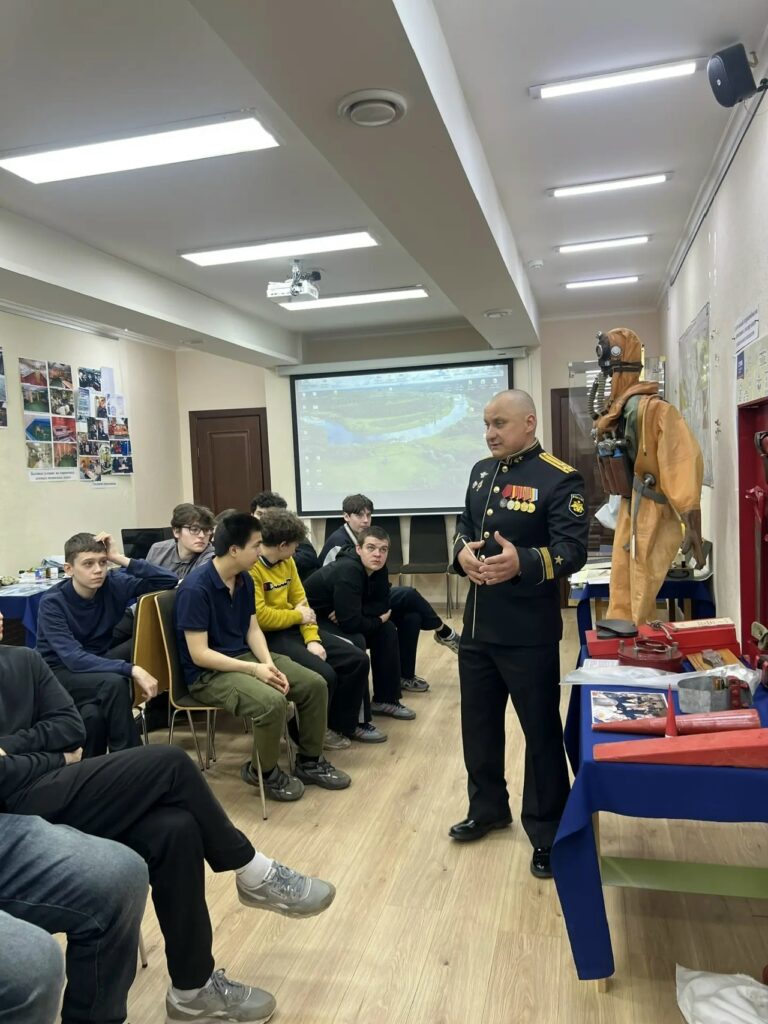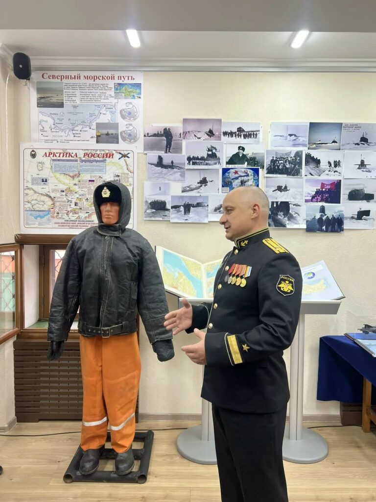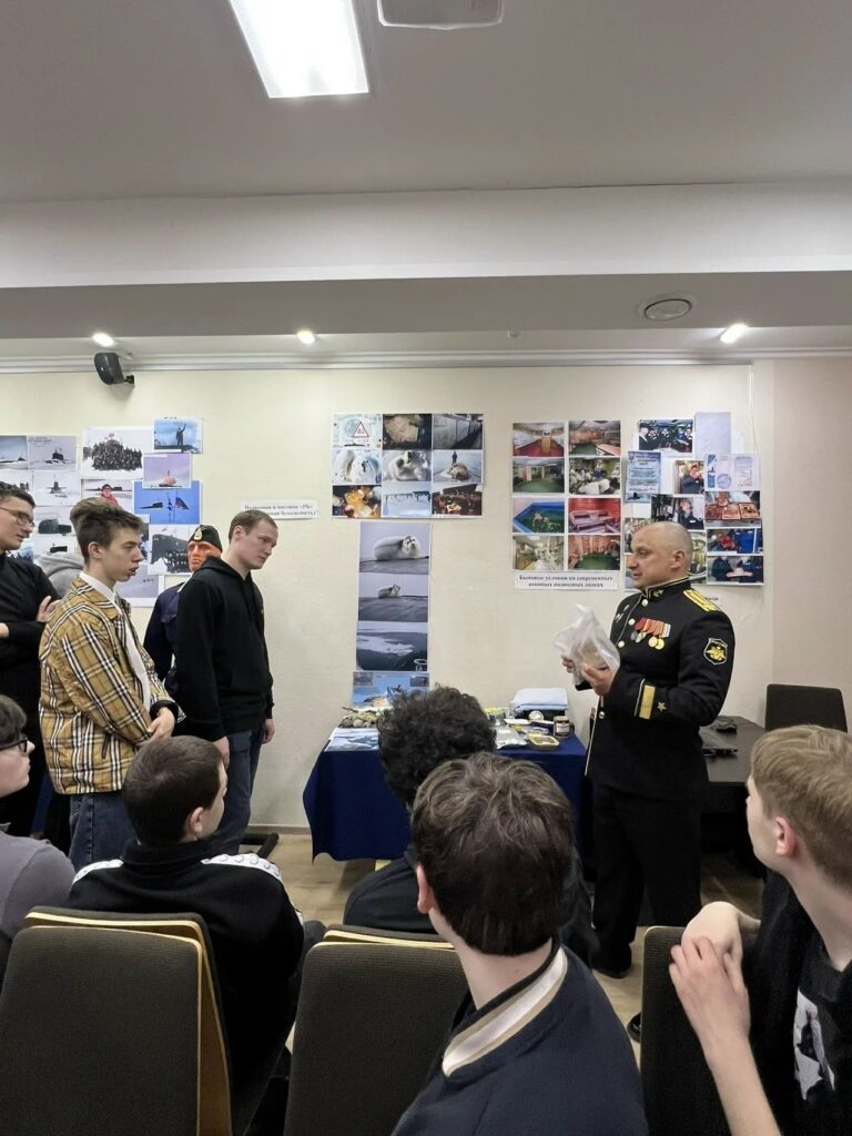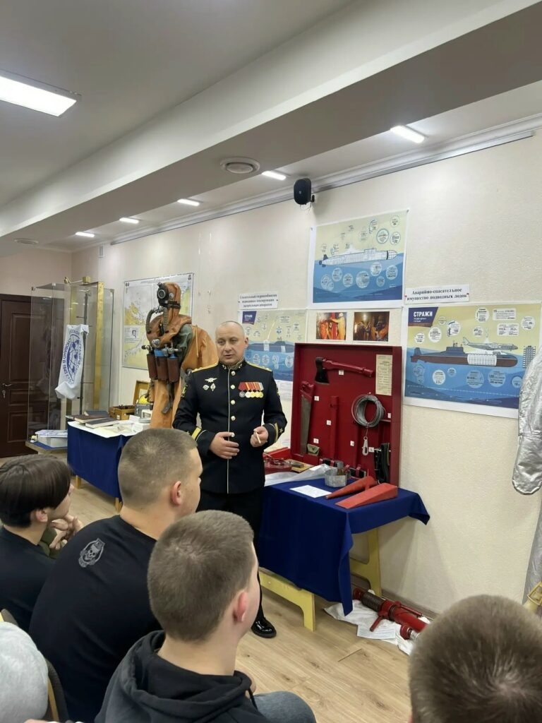Экскурсию студентам провёл капитан 1-го ранга Николай Герасимов, служивший на подводной лодке проекта 941 «Акула» и отлично знакомый с темой изнутри. Опытный моряк-подводник, имевший за плечами несколько «автономок», он поведал о предназначении атомных подводных лодок, их месте в составе военно-морского флота, рассказал о традициях русских подводников, привёл в пример несколько интересных случаев из личного опыта.