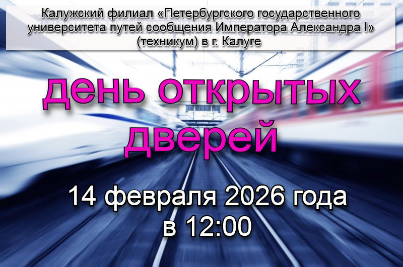 14 февраля 2026 года Калужский филиал «Петербургского государственного университета путей сообщения Императора Александра I» (техникум) в г. Калуге проводит день открытых дверей.