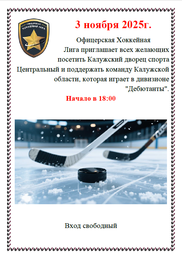 Офицерская Хоккейная Лига приглашает всех желающих посетить Калужский дворец спорта Центральный и поддержать команду Калужской области, которая играет в дивизионе «Дебютанты».