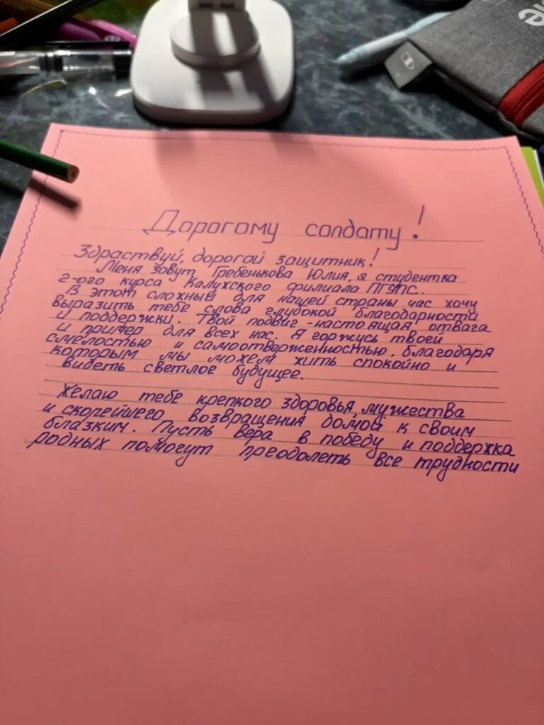 В своих письмах студенты не просто поздравляют бойцов с 23 февраля, но и рассказывают о себе, об учебе, желают скорейшего возвращения домой с победой. Каждое письмо получилось особенным, наполненным теплом и искренними эмоциями.