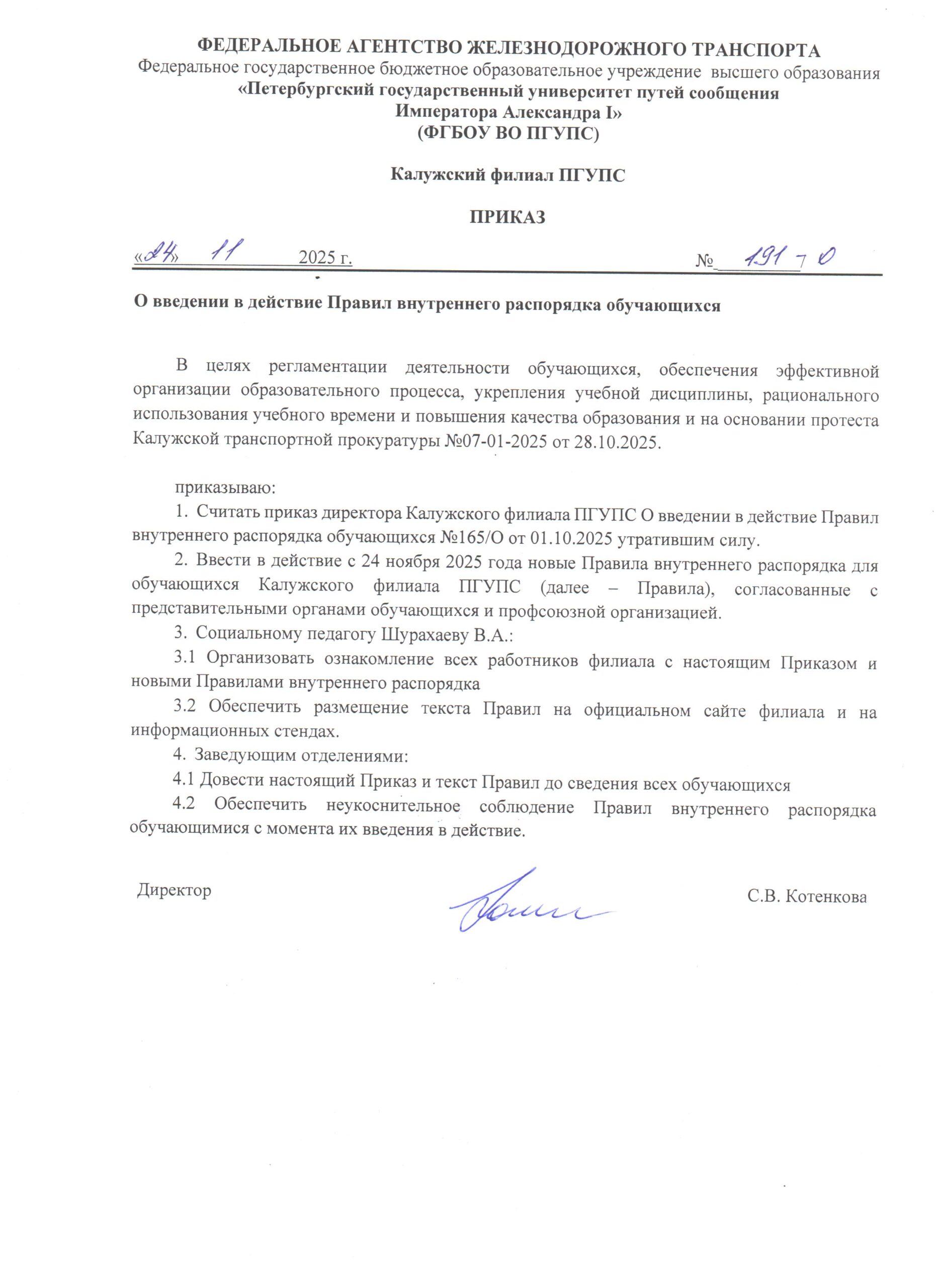 Приказ 191-О от 24.11.2025 О введении в действия Правил внутреннего распорядка обучающихся скачать